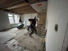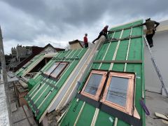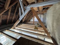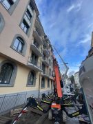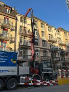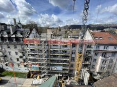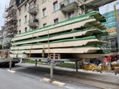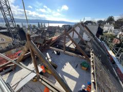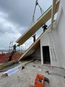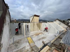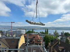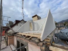 | Der Zeitraffer zeigt Abbruch von Dach und Estrich: | Am 17. April wurde das Dachgeschoss aufgerichtet: |